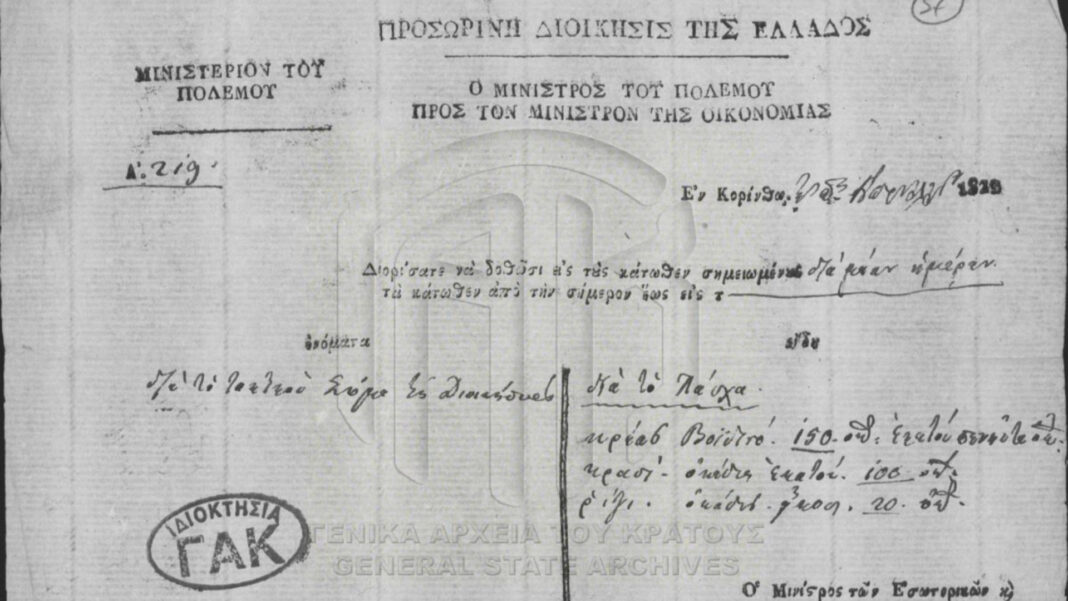 Την ίδια περίοδο, ο μινίστρος (υπουργός) των Εσωτερικών και προσωρινός μινίστρος του Πολέμου ζητά από το μινιστέριο Οικονομίας να δοθούν στο προσωπικό του Τακτικού Σώματος της Διοικήσεως για την ημέρα του Πάσχα από 150 οκάδες κρέας βοδινό, 100 οκάδες κρασί και 20 οκάδες ρύζι.