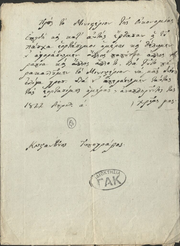 «Επειδή και κατ’ αυτάς έφτασαν αι του Πάσχα εορτάσιμοι ημέραι και θέλομεν ν’ αγοράσωμεν άλλος παπούτσια, άλλος τζουράπια και άλλος άλλο τι, δια τούτο παρακαλούμεν το Μινιστέριον να μας δώση ολίγα γρόσια δια ν’ απεράσωμεν ταύτας τας εορτασίμους ημέρας, αναπληρούντες τας χρείας μας».